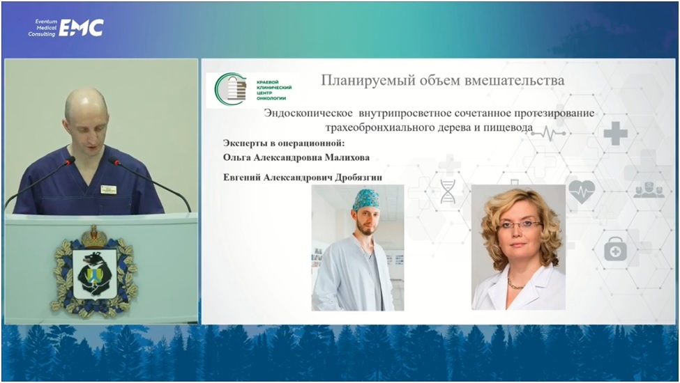 На конференции были представлены доклады региональных, федеральных и зарубежных экспертов, а также велись трансляции мастер-классов из операционных. В частности, эксперты Малихова Ольга Александровна (руководитель направления госпитальной эндоскопии клиники Hadassah, доктор медицинских наук, доцент ВАК, профессор кафедры онкологии и паллиативной медицины РМАНПО) и Дробязгин Евгений Александрович (главный внештатный специалист по эндоскопии МЗ НСО, заведующий эндоскопическим отделением ГНОКБ, доктор медицинских наук, доцент, профессор кафедры госпитальной и детской хирургии лечебного факультета НГМУ) выполнили эндоскопическое внутрипросветное сочетанное протезирование трахеобронхиального дерева и пищевода. Установка обоих стентов пациенту была выполнена успешно.